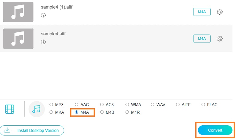 次に、をクリックします オーディオフォーマット オプション。次に、ツールで使用可能な形式のリストが表示されます。 M4Aにチェックマークを付けて、 変換 ボタンをクリックすると、変換プロセスが開始されます。