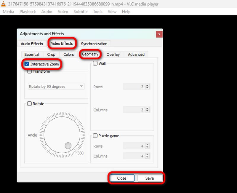 手順4. エフェクトとフィルターウィンドウで、ビデオエフェクト>ジオメトリを開きます。そこでインタラクティブズームにチェックを入れ、下部の保存>閉じるボタンをクリックします。